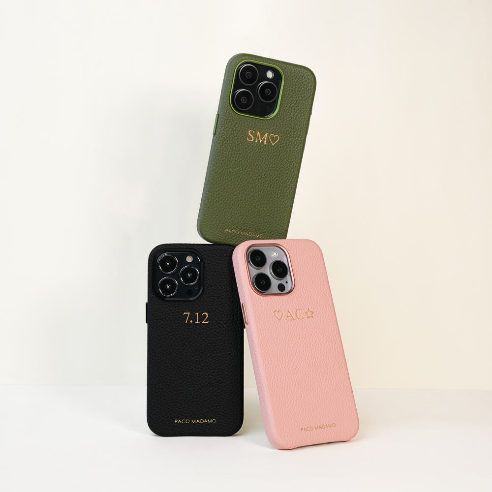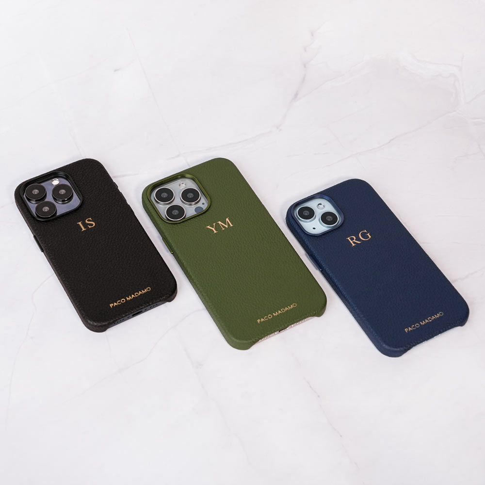 Our Vegan Pebble leather is enhanced by modern utilitarian details. Our cases are compact, functional, and versatile. The sleek shape allows for easy wear, offering superior protection for your phone. Crafted with precision, our newest feature includes an aluminum metal ring encircling the camera and buttons, adding a distinctive touch of sophistication to your device. As a special touch, add your initials with complimentary monogramming.