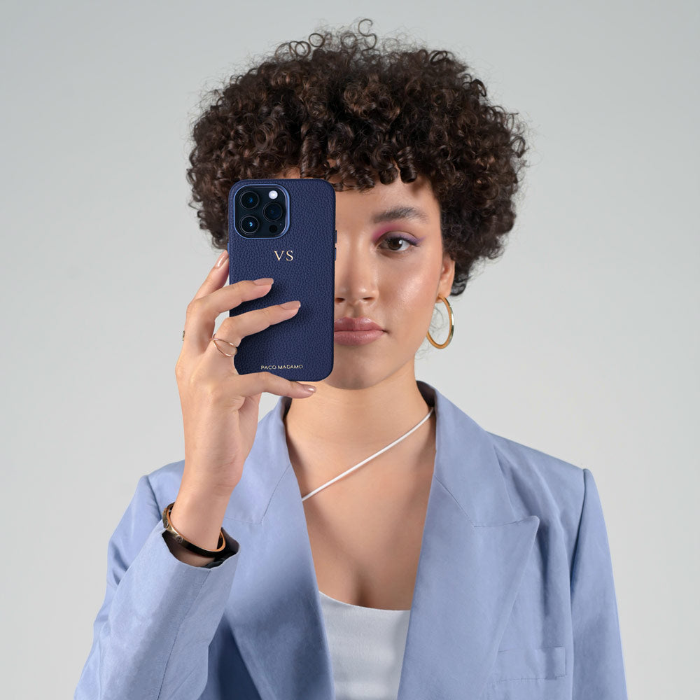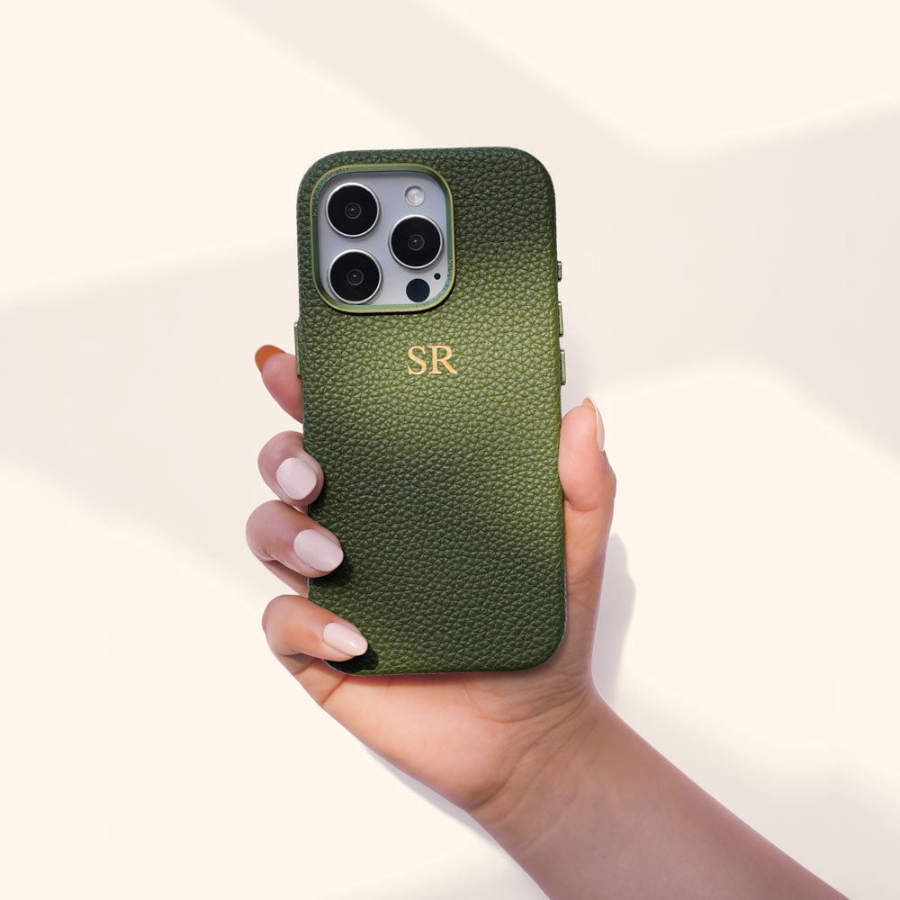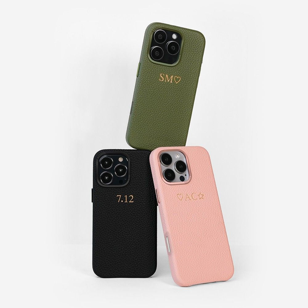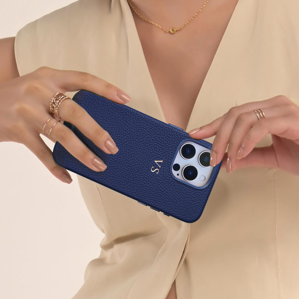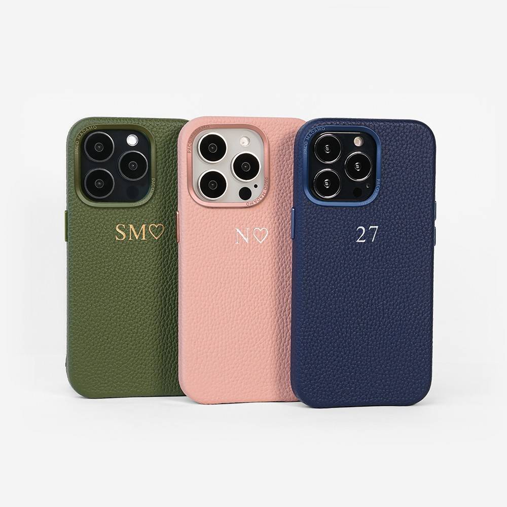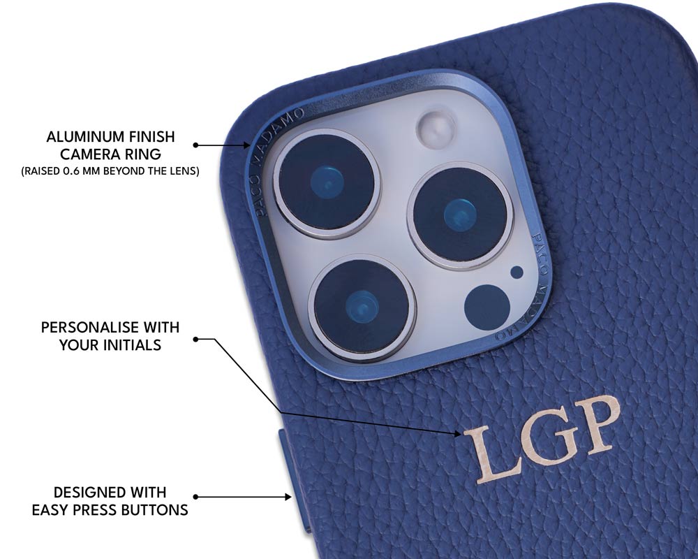 Our Vegan Pebble leather is enhanced by modern utilitarian details. Our cases are compact, functional, and versatile. The sleek shape allows for easy wear, offering superior protection for your phone. Crafted with precision, our newest feature includes an aluminum metal ring encircling the camera and buttons, adding a distinctive touch of sophistication to your device. As a special touch, add your initials with complimentary monogramming.