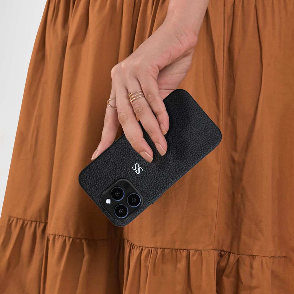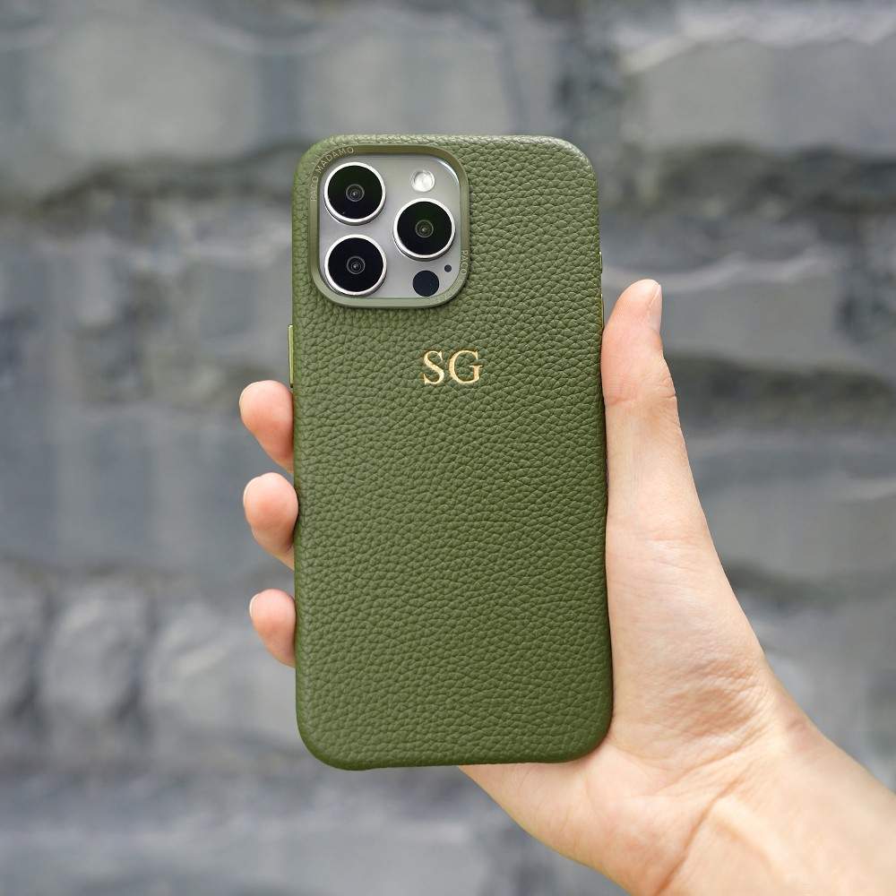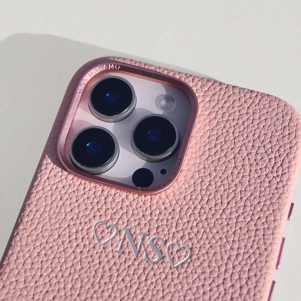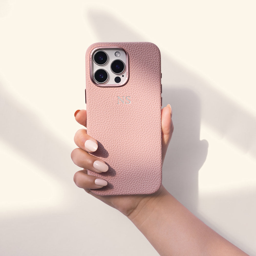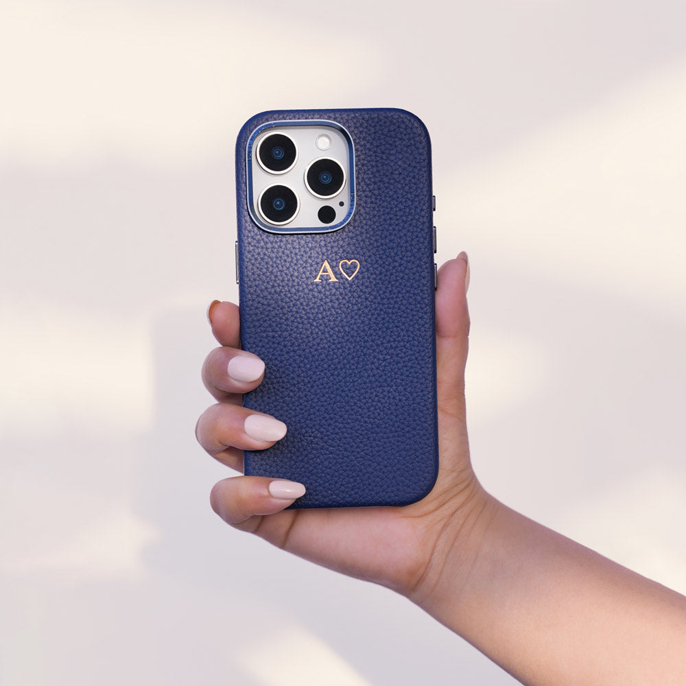 Our Vegan Pebble leather is enhanced by modern utilitarian details. Our cases are compact, functional, and versatile. The sleek shape allows for easy wear, offering superior protection for your phone. Crafted with precision, our newest feature includes an aluminum metal ring encircling the camera and buttons, adding a distinctive touch of sophistication to your device. As a special touch, add your initials with complimentary monogramming.